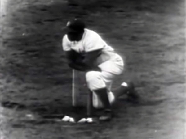 In the booth were Mel Allen and Red Barber. Both announcers had a facility with language that is now part of the game. (Allen coined, among other expressions, “Going, going, gone!”) As late afternoon sets in, Barber provides some useful explanation for the viewer struggling to make out an odd shape on their black-and-white television set: “You can begin to see the marks now of the shadow of the stands out from home plate toward the mound. The irregularities at the edge of the shadow are men and cameras on the top of the stands, casting their shadows.”